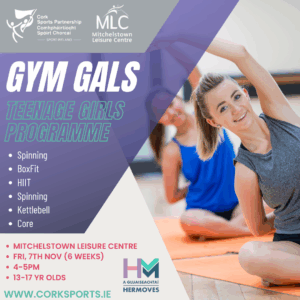 Cork Sports Partnership through the Her Moves Campaign are delighted to launch a new Gym Gals Programme for teenage girls aged 13-17 years old this November with Mitchelstown Leisure Centre
